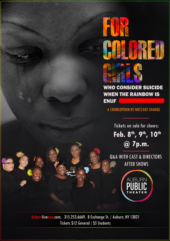 So this month as our country celebrates Black History Month, I am celebrating my friend Gwen Webber-McLeod and her production of “For Colored Girls Who Have Considered Suicide When the Rainbow is Enuf” which is playing at the Auburn Public Theater, supported by Artistic Director Angela Daddabbo. I bought ten tickets for the February 8th show so women interested can join me and learn more about our African American sisters during Black History Month.