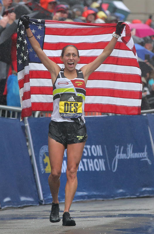 (041618 Boston, MA) Women’s winner Desiree Linden celebrates with an American flag as she crosses the finish line of the Boston Marathon on Monday,April 16, 2018. Staff Photo by Nancy Lane
