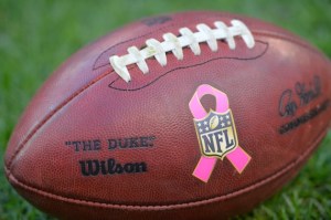 An NFL football with the Breast Cancer Awareness Month logo sits on the field during an NFL football game between the Cleveland Browns and the Denver Broncos(AP Photo/David Richard)