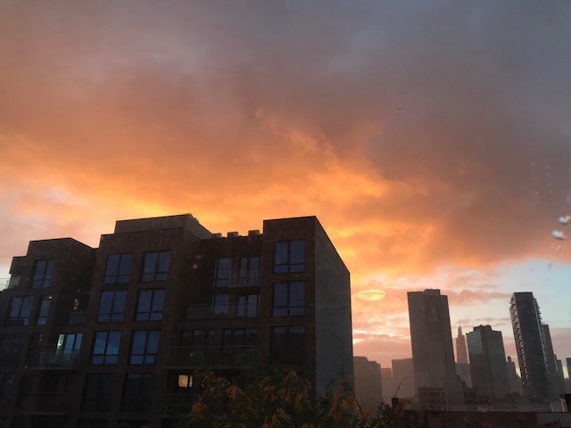 As my car wound its way, with different colors, makes, and models of cars, buses, vans, and taxies from Long Island City onto the FDR Highway to take me home via the George Washington Bridge, the dark blue sky dissipated to a pastel blue one with wisps of golden-pinkish-orange clouds dotting the horizon. It was hard to keep my eye on the road because the painted sky evolved so beautifully.