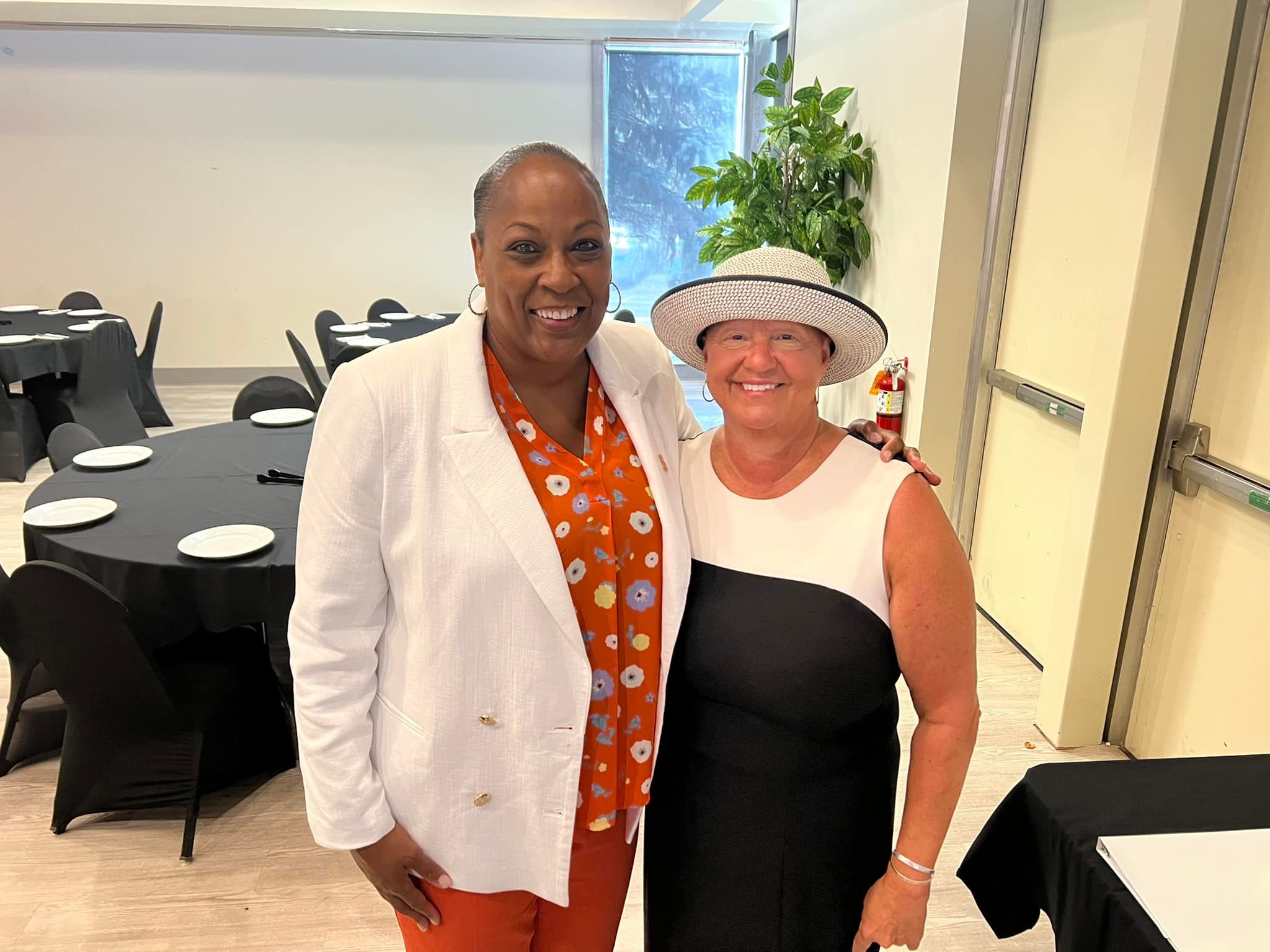 Walking into the room was a tall figure dressed in orange clothes with a white blazer followed by her entourage. They passed the table of six purple, white and gold jacketed women with the word “highlight” down their arms – an all-female sky diving team with suffragette colors. From my table of guests which included women entrepreneurs and women who love sports, we could see the star speaker sit and relax. I recognized her immediately and went to grab a photo.
