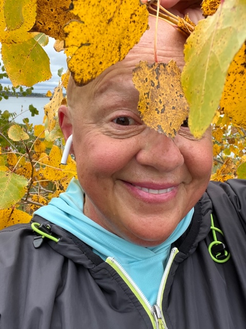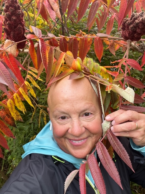 As I rode my bike today, along the once all-green covered path, I noticed how the green changed to varying shades of gold, orange, crimson, brown, and even dark purple. One particular tall weed with its slightly bent tip with hanging, shaggy, brown, feather-like leaves caught my eye and sparked my own imagination. Off my bike I went to put the hair-like leaves where my bangs once were before I lost my hair to alopecia. It became an imaginary “shag wig” and off I rode looking for other leaves or weeds to add to my new “natural wig collection.”