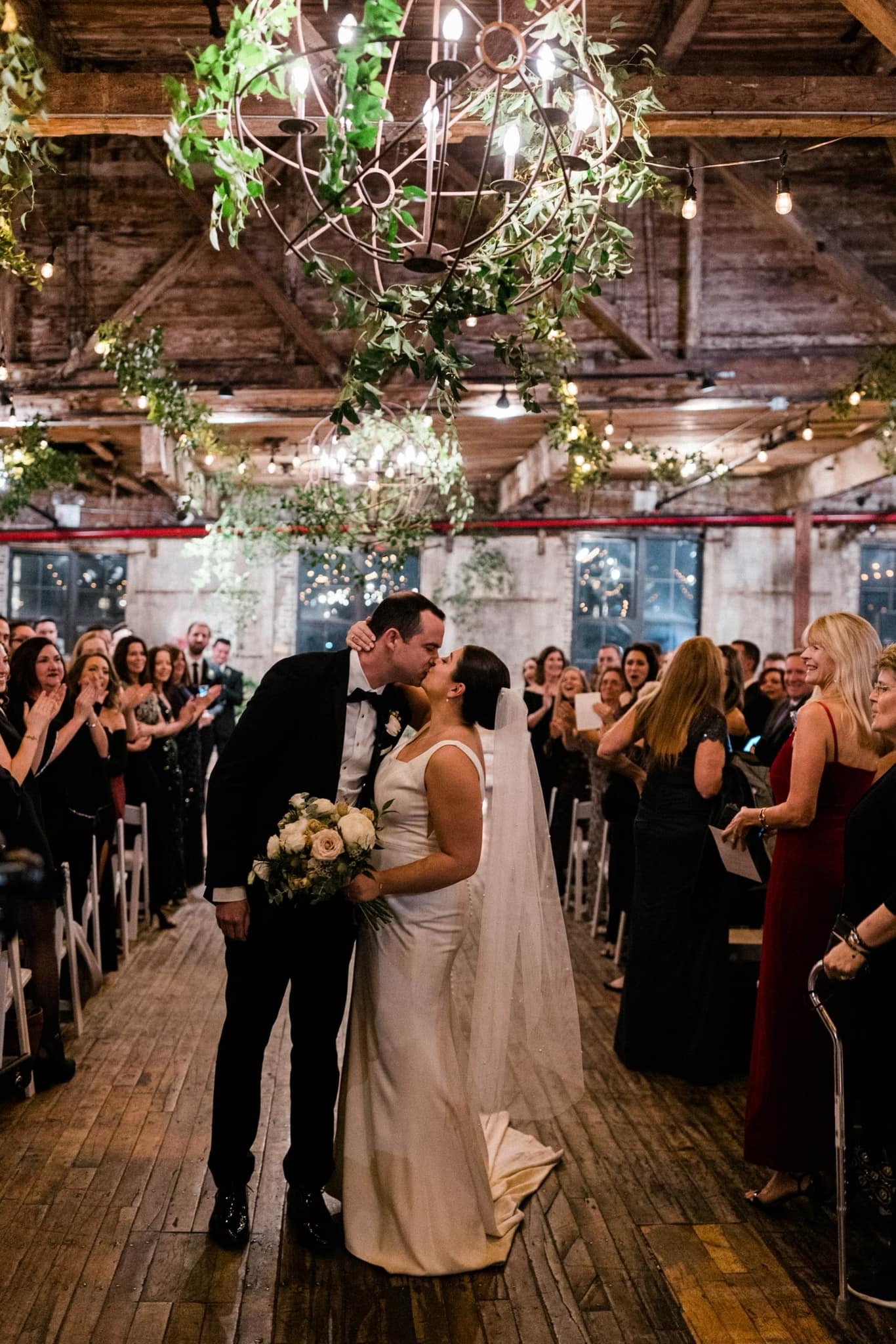 Twinkle lights intertwined with live greenery hung from the old rope factory beams setting the stage for the New Year’s Eve Wedding Celebration as guests gathered under these ‘stars’ finding their seats in brilliant white chairs. Right on cue the expert wedding planner directed the bridal party down the aisle in step with the processional music provided by a popular wedding disc jockey. The pastor, chosen for the occasion, waited patiently, smiling until the bride arrived in front of him unlinking arms with her father as both their matching dimples radiated the joy of the moment.