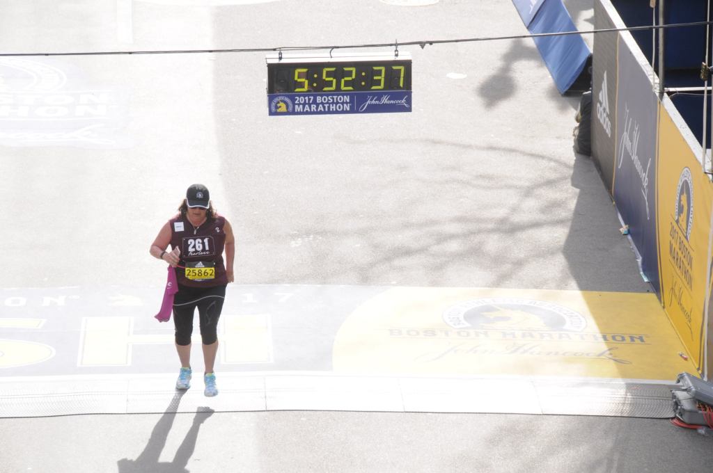 The last .2 miles of the Boston Marathon brings you along Boylston Street with people yelling and cheering so loudly that if your spirit and legs were going to give out, they couldn’t because they were lifted by the community there to do just that. It is a euphoric moment hearing them. My last push was saying the Hail Mary prayer as I touched my blessed rosary beads around my wrist. The camera caught my half-leaning posture, as if I was the Tower in Pisa, just trying to get across that blue and yellow victory line.