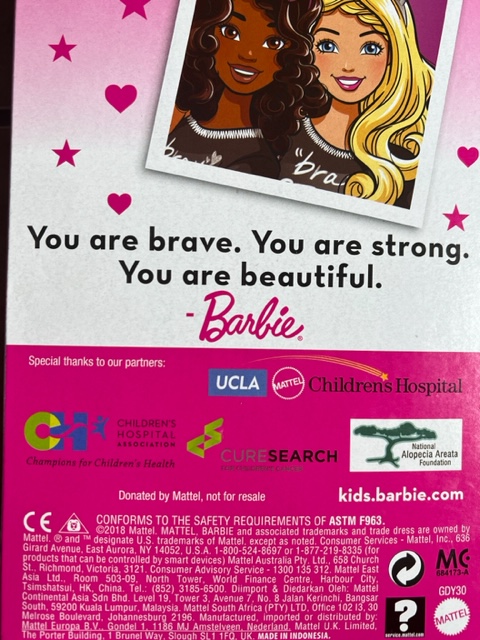 I am touched by a company like Mattel that donates these bald Barbie dolls to Children’s Hospitals, the Alopecia Foundation, the Cure Search, and UCLA Mattel Children’s Hospital to comfort children and raise money.