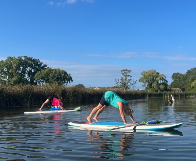 As Lynne took us through contemplative poses all while “our floor” was moving below us, we struck many recognizable poses like downward dog, and child’s pose, and eventually moved up to tree pose and even jumped up off our boards into the air. No one fell in but delighted in the playfulness of yoga on a floating board in the middle of the afternoon.