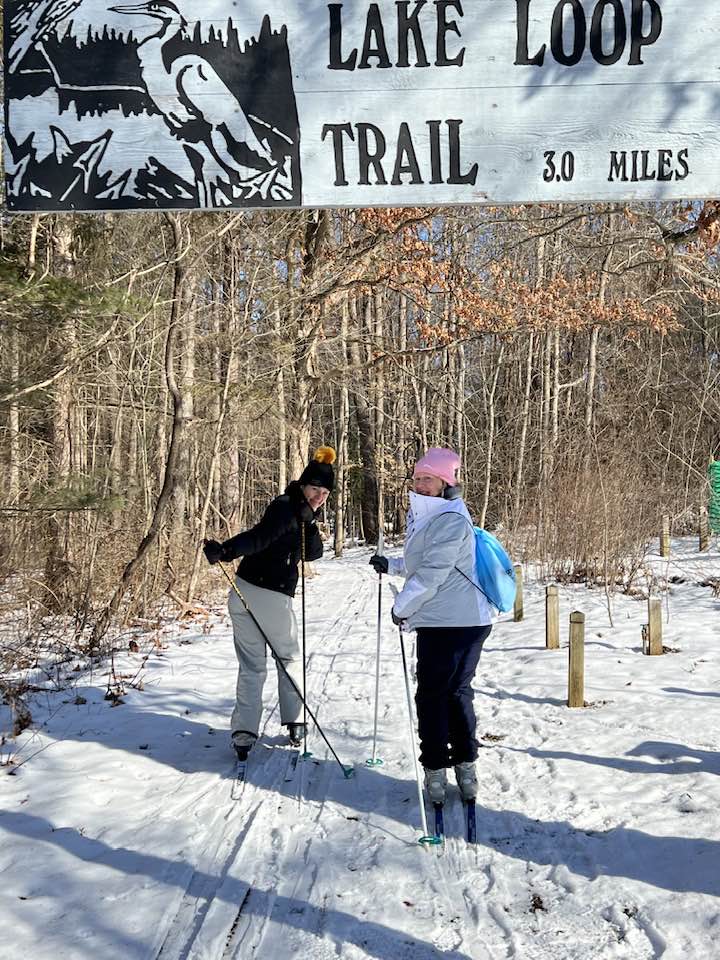 The three of us began together but soon decided Jennifer should take off on the 3-mile lake loop while I stayed with our Janet and help her if she needed it. I was able to use my parent’s teaching tools and 50- years of experience to “glide” her along, giving her pointers on movement, how to go up slight hills with slipping backwards, and even how to get up when you fall – as evident by my own tumble – which made us both laugh! Hey, even old-time skiers fall sometimes.