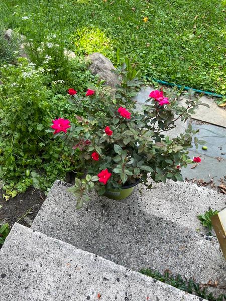 My son and future daughter-in-law carried a rose plant in a light green pot to my side kitchen door, a gift to me on the passing of a dear friend two days before. There were only a few flowers on the green leaves but my son said the lady at the nursery said there would be up to 10 more blooms and to wait to see them pop. How sweet I thought, not sure he knew roses typically bloomed at their height in June, but loving his intentions.