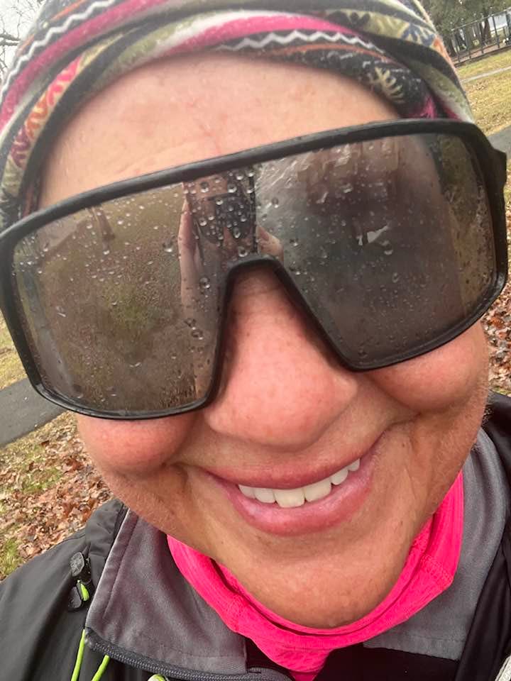 Midway through my run, my sunglasses were so speckled with raindrops and fog from overheating that I could not see anything. Should I take my sunglasses off so I can see where I’m going? I wondered. I rejected the notion, knowing I knew the straight, flat path and also wondering what it was like to be a blind runner.